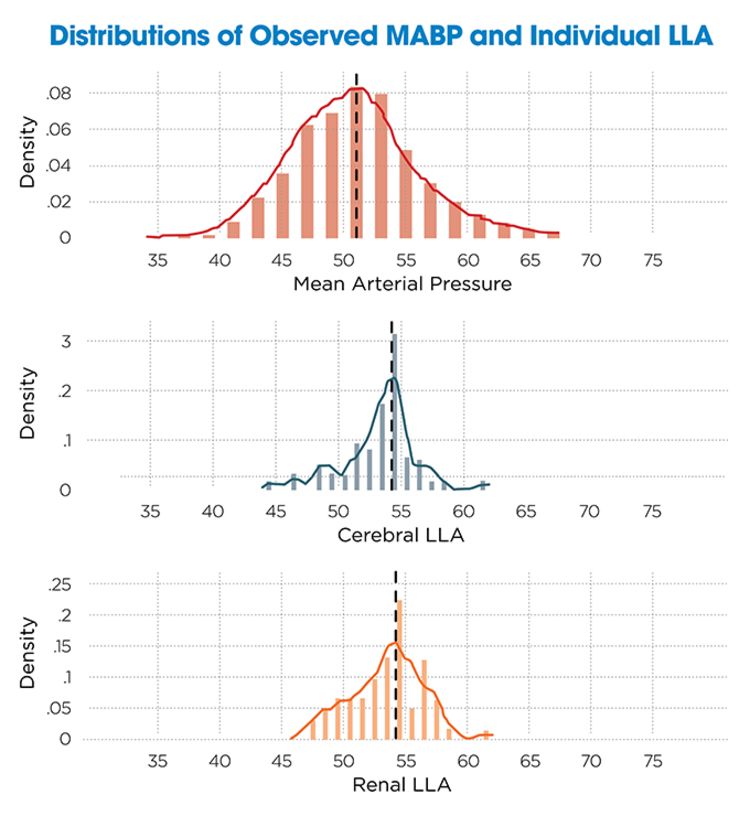 In a study of 200 neonates, we evaluated the autoregulation relationship between MABP and oxygen saturation in the brain (rSO₂C) and kidneys (rSO₂R) over a 48-hour perioperative period.⁴ Using nonlinear regression, we identified the lower limit of autoregulation (LLA) — the threshold below which the organ can no longer maintain stable perfusion. We found most LLAs in the 45–50 mmHg range for both regions, but cerebral perfusion dropped more steeply as pressure declined. Interestingly, renal saturation also decreased at pressures above 65 mmHg, suggesting that some increases in blood pressure come at the expense of organ perfusion.