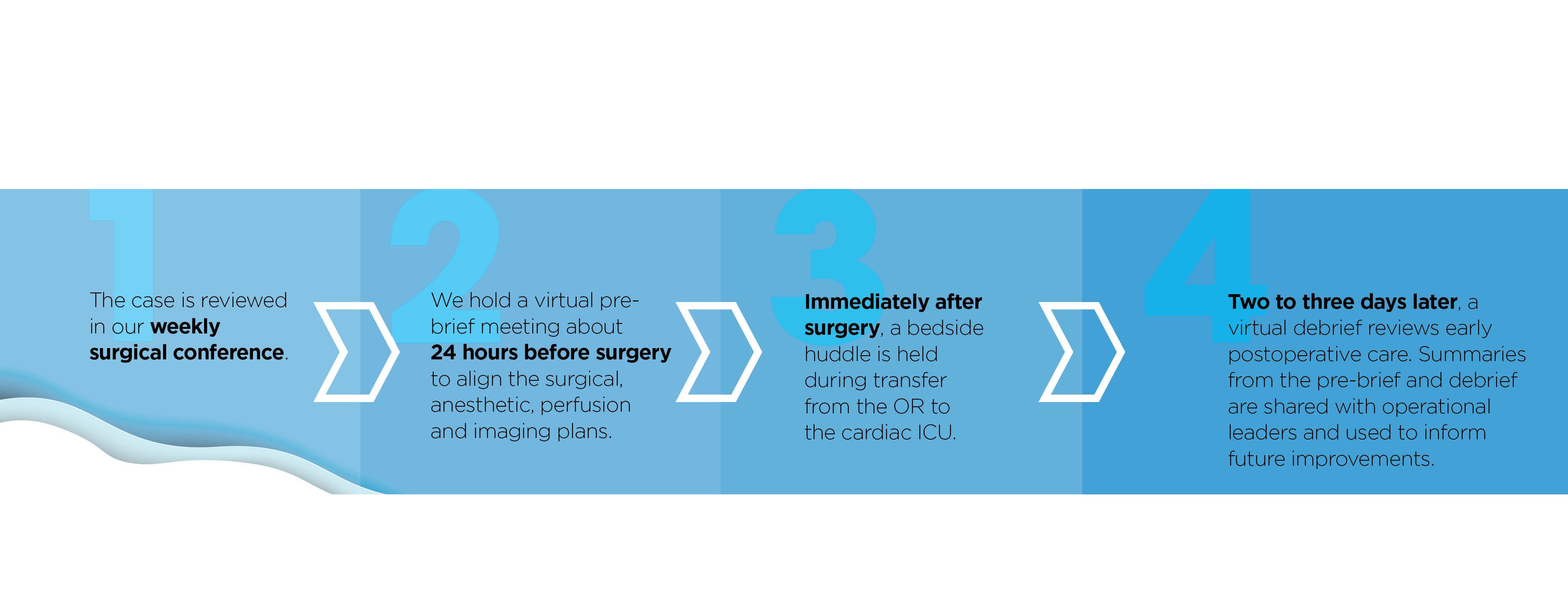4. Two to three days later, a virtual debrief reviews early postoperative care. Summaries from the pre-brief and debrief are shared with operational leaders and used to inform future improvements.