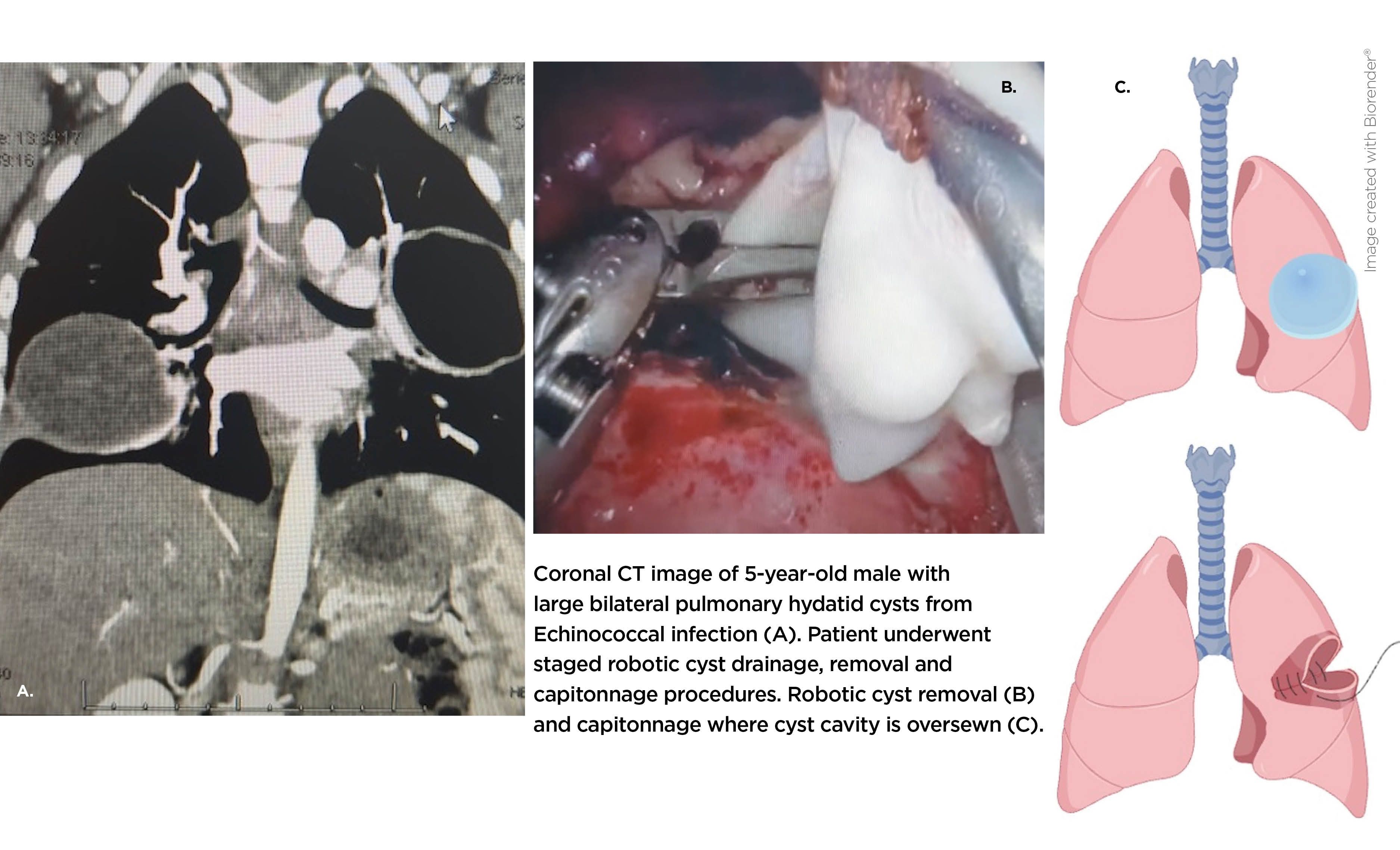 Between April 2024 and July 2025, our team completed 10 collaborative pediatric robotic thoracic surgeries, including eight performed at Children’s Wisconsin. Among them were three lung surgeries for echinococcal hydatid cysts in two children with bilateral disease, representing the youngest reported patients treated robotically for this condition.
